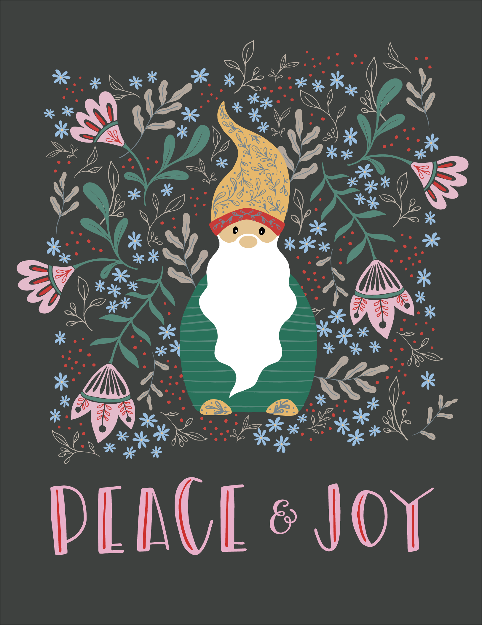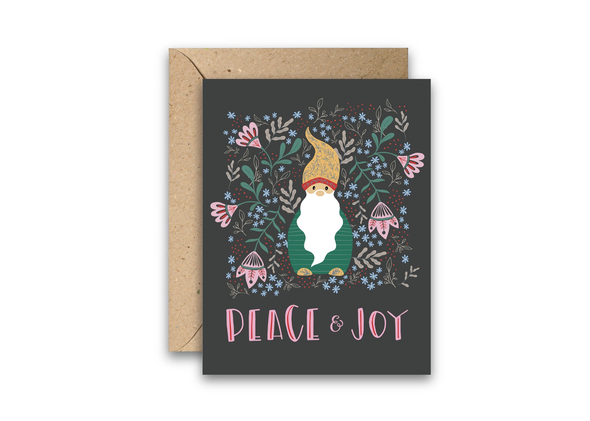 Spread holiday cheer with the Peace and Joy Gnome Greeting Card. Featuring a whimsical gnome surrounded by pink, blue, and green florals with “Peace and Joy” along the bottom, this cheerful design is perfect for sending warmth and festive wishes. A delightful way to brighten the season.