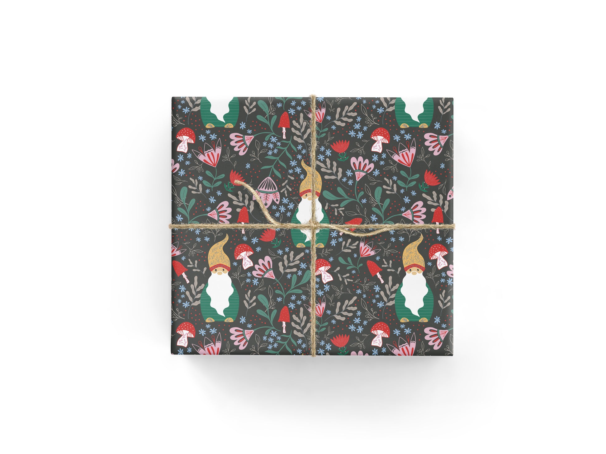 Bring magic to your gifting this Holiday with the Gnome & Mushroom Wrapping Paper, featuring a cheerful forest gnome surrounded by red-capped mushrooms, wildflowers, and garden foliage. Set against a deep gray background, this festive and whimsical wrap includes hand-drawn artwork by Amita Nair, making it perfect for holiday gifts, winter birthdays, seasonal craft projects, and folk-inspired decor.