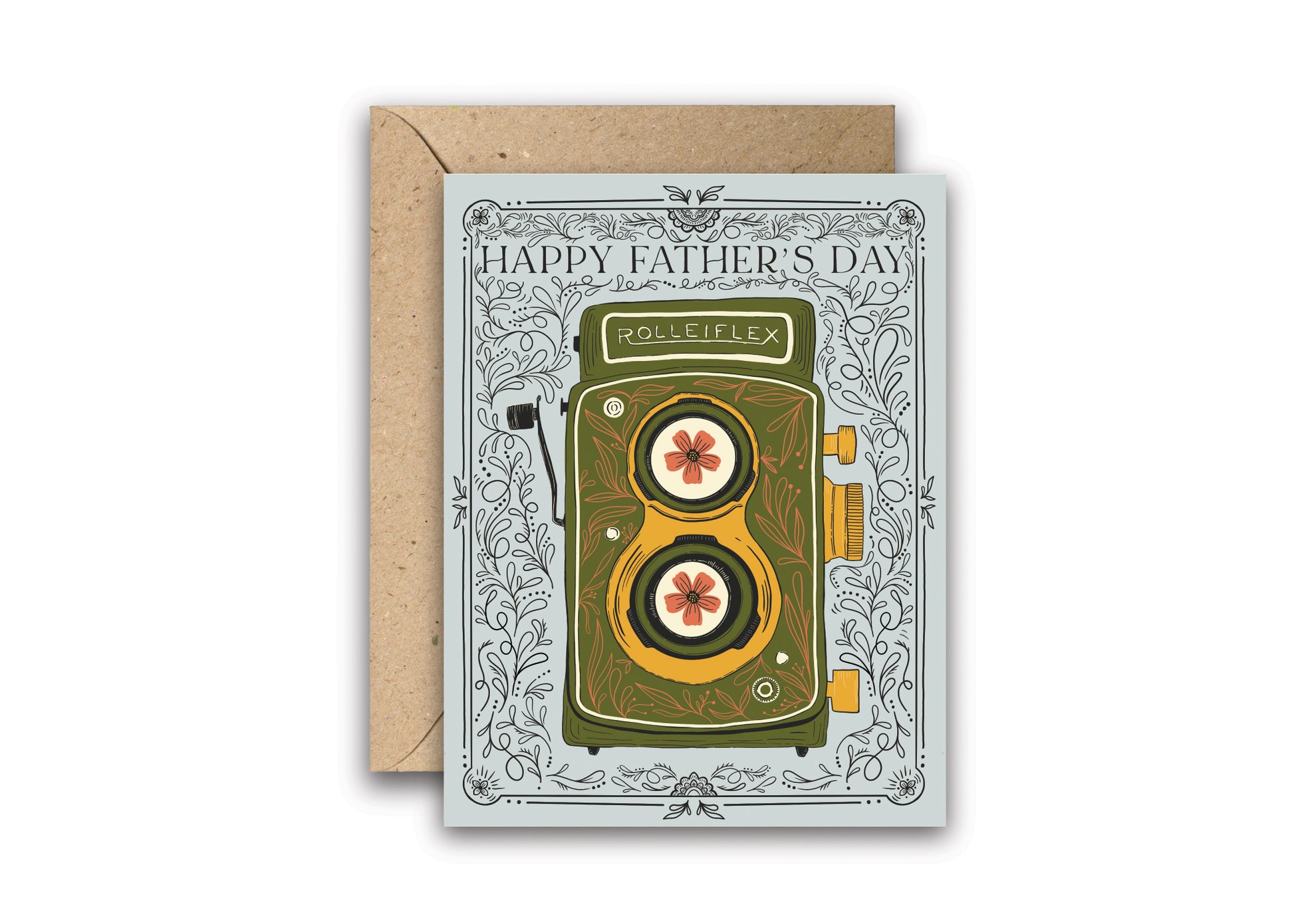 Celebrate the bond of fatherhood with the Best Memories Vintage Camera Father’s Day Card. Featuring a detailed green Rolliflex camera with yellow coral accents on a serene grey-blue backdrop, this vintage-inspired design is perfect for dads who cherish photography and memories. A thoughtful way to share love and gratitude on Father’s Day.