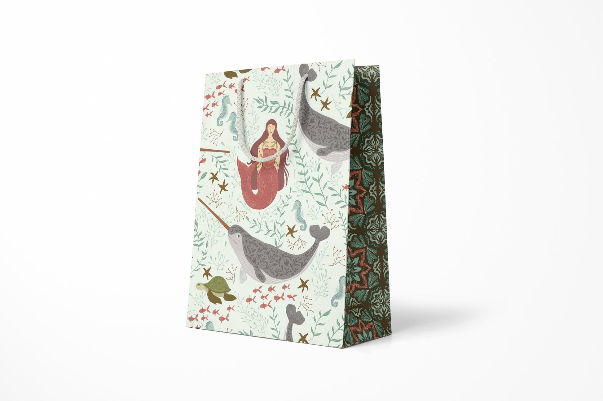 Introducing our "Calm Seas" Gift Bag - the perfect way to elevate your gift presentation with elegance and style. This stunning gift bag showcases beautifully illustrated sea animals, including narwhals, turtles, seahorses, and an elegant mermaid on the outside, complemented by a coordinating pattern on the side. Crafted from heavyweight coated paper, this bag not only adds charm to your gift-giving but can also be saved for regifting or used for various errands.