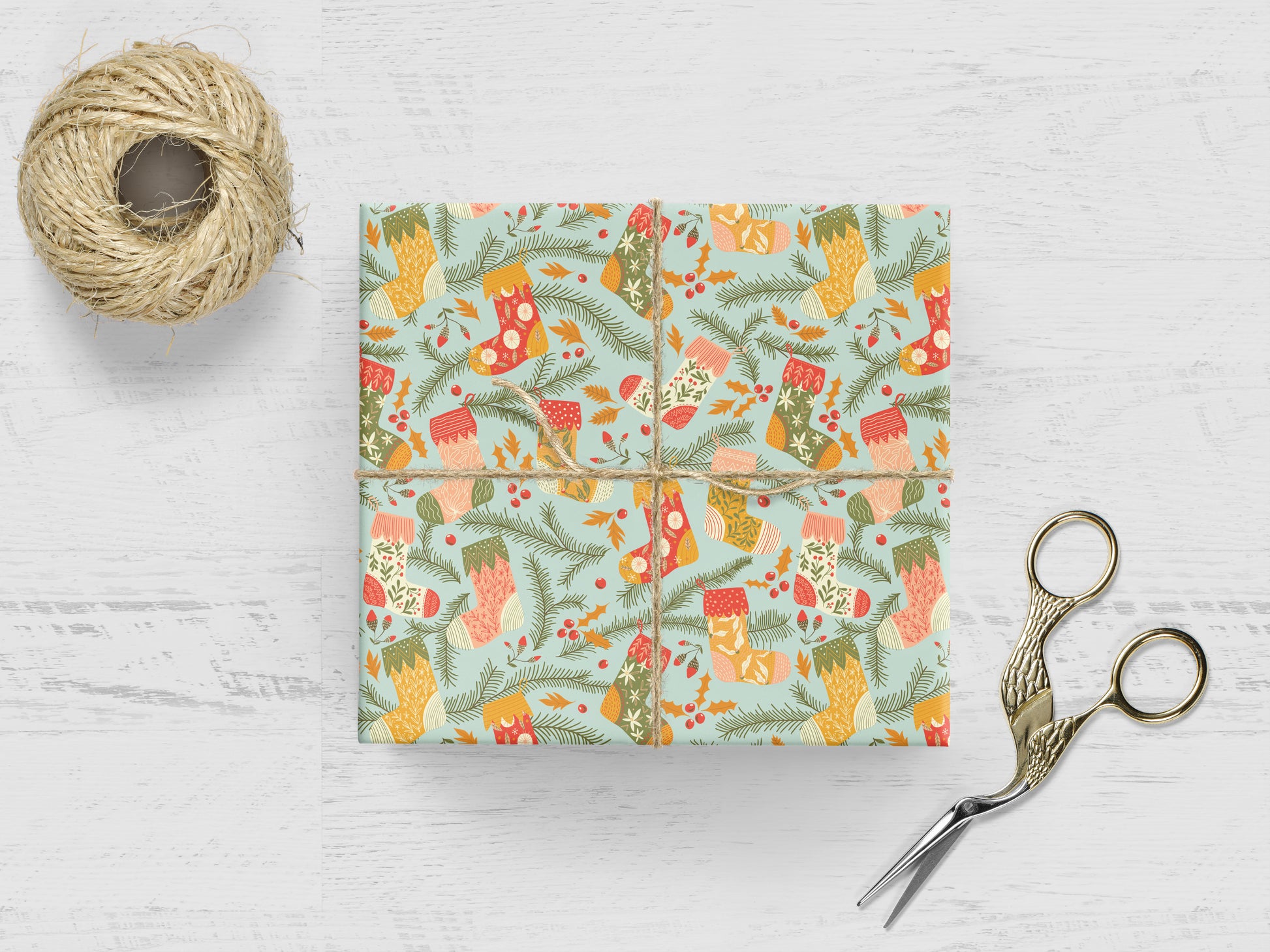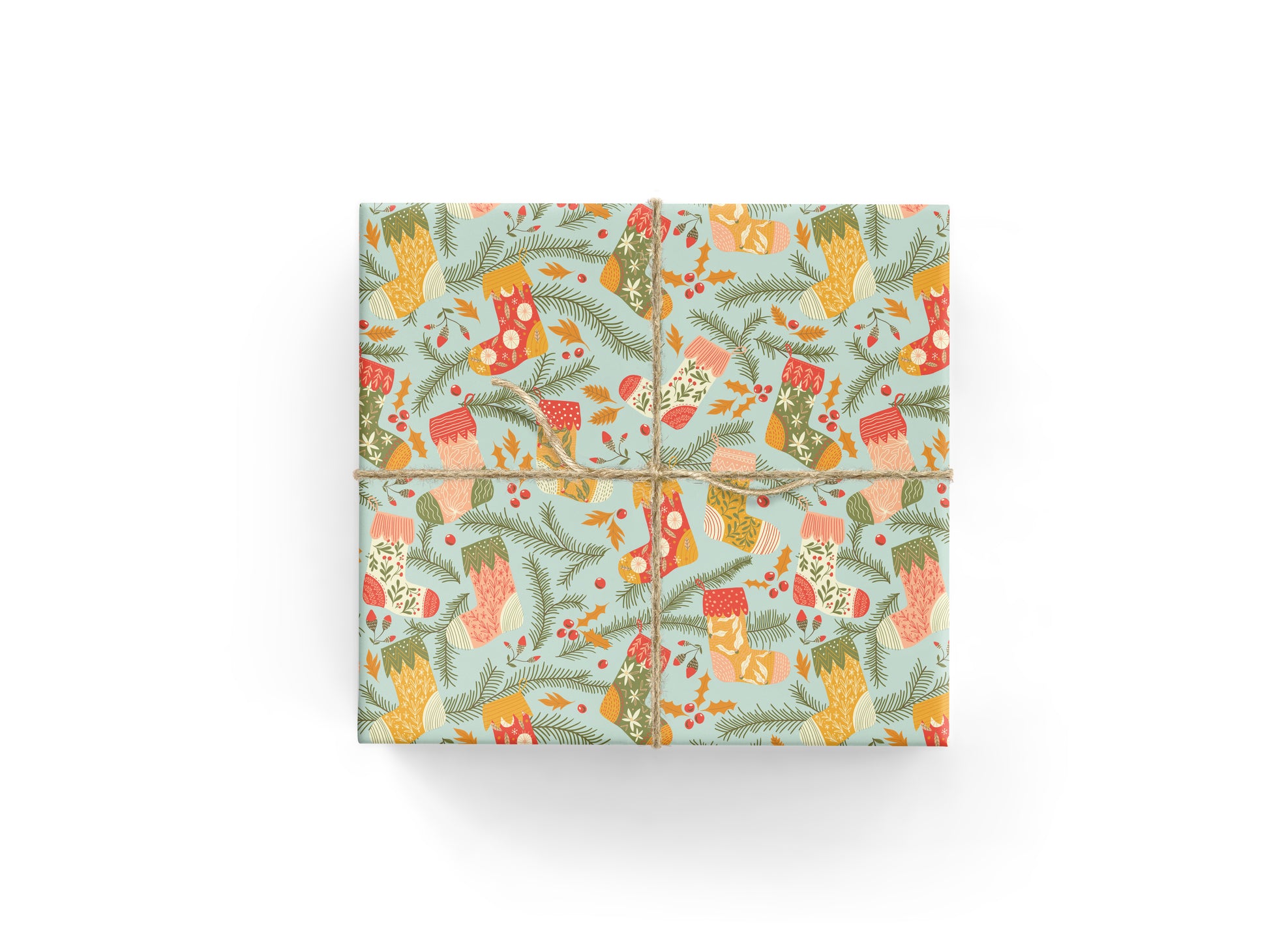 Get ready to Deck the halls with this festive wrapping paper featuring hand-drawn Christmas stockings, holly leaves, and red berries by artist Amita Nair. With a nostalgic, cheerful design and vibrant colors, it’s the perfect touch for holiday gifts, and winter birthdays.