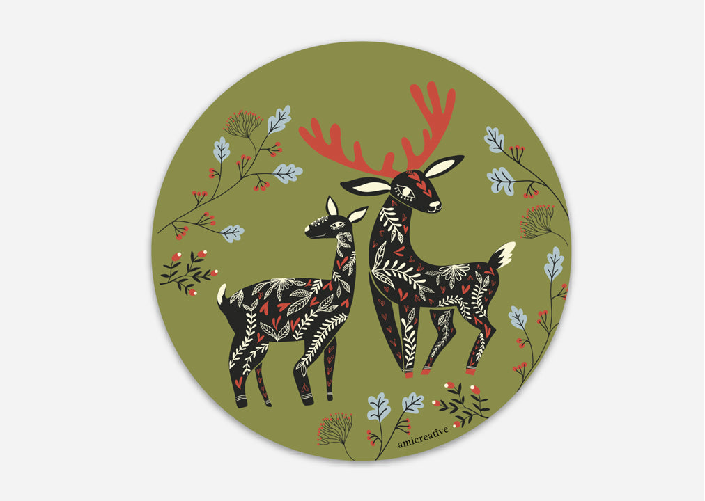 Features delightful deer in a wintry folk style, evoking the magic of the season