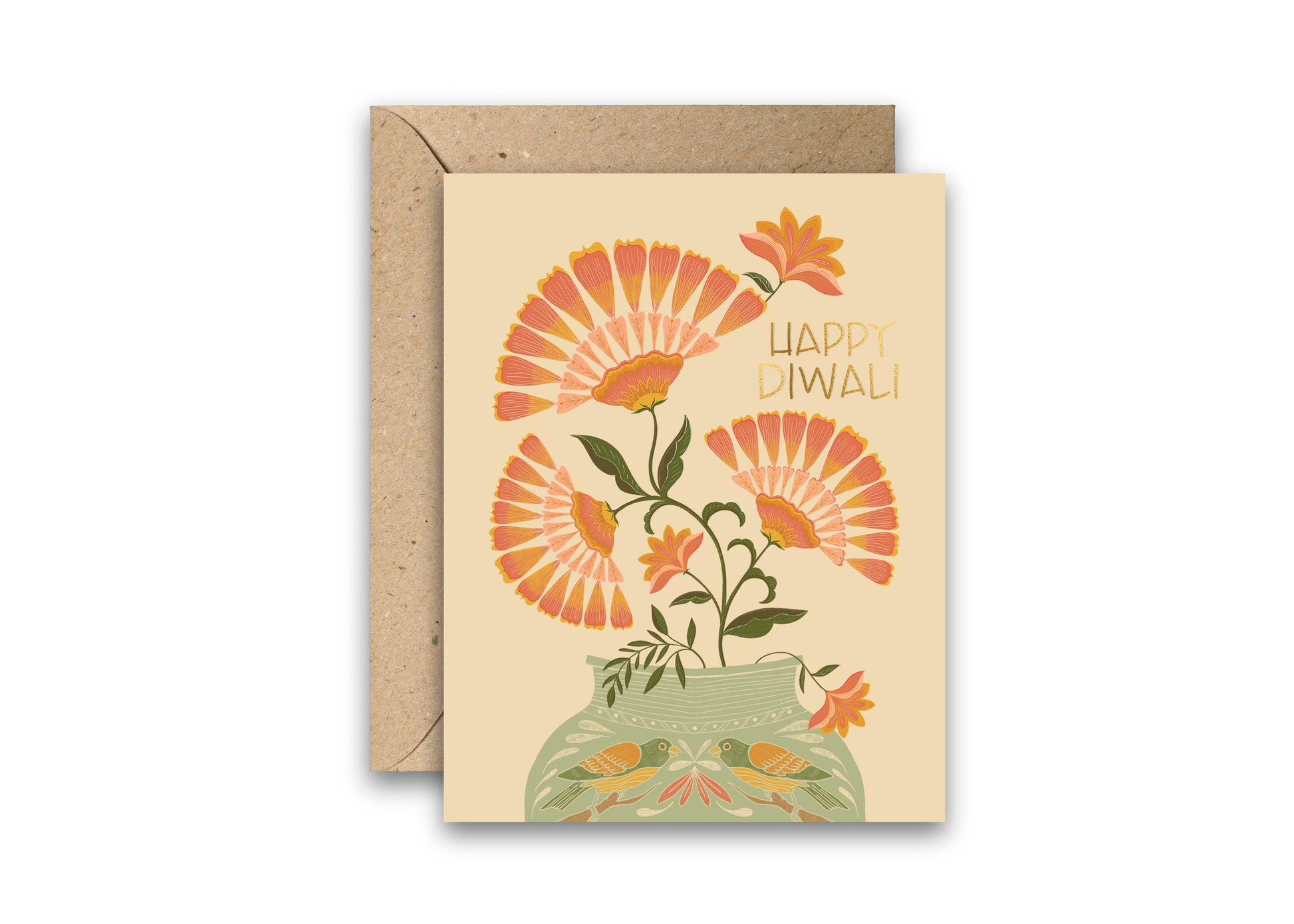 Celebrate the Festival of Lights with the Diwali Bouquet Gold Foil Greeting Card. Featuring a beautifully adorned vase filled with vibrant florals and graceful birds, this exquisite design shimmers with delicate gold foil details and “Happy Diwali” lettering. A radiant way to share joy, peace, and beauty during the season of light.