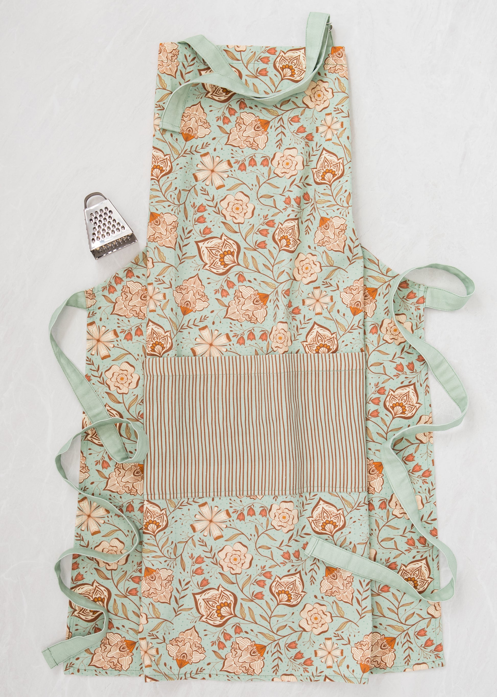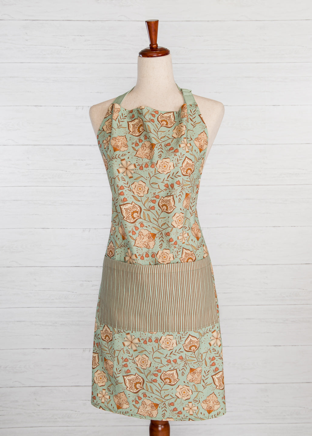 Step into sophistication with the English Garden apron, featuring an aqua blue background with elegantly illustrated flowers in creams, browns, and oranges, intertwined with vines and leaves. This apron exudes elegance and taste, suitable for any occasion. Its design is not only beautiful but also functional, with a large front pocket to keep necessary items close at hand. A perfect gift for any enthusiast who appreciates the finer things in life, this apron should be a staple in every kitchen.