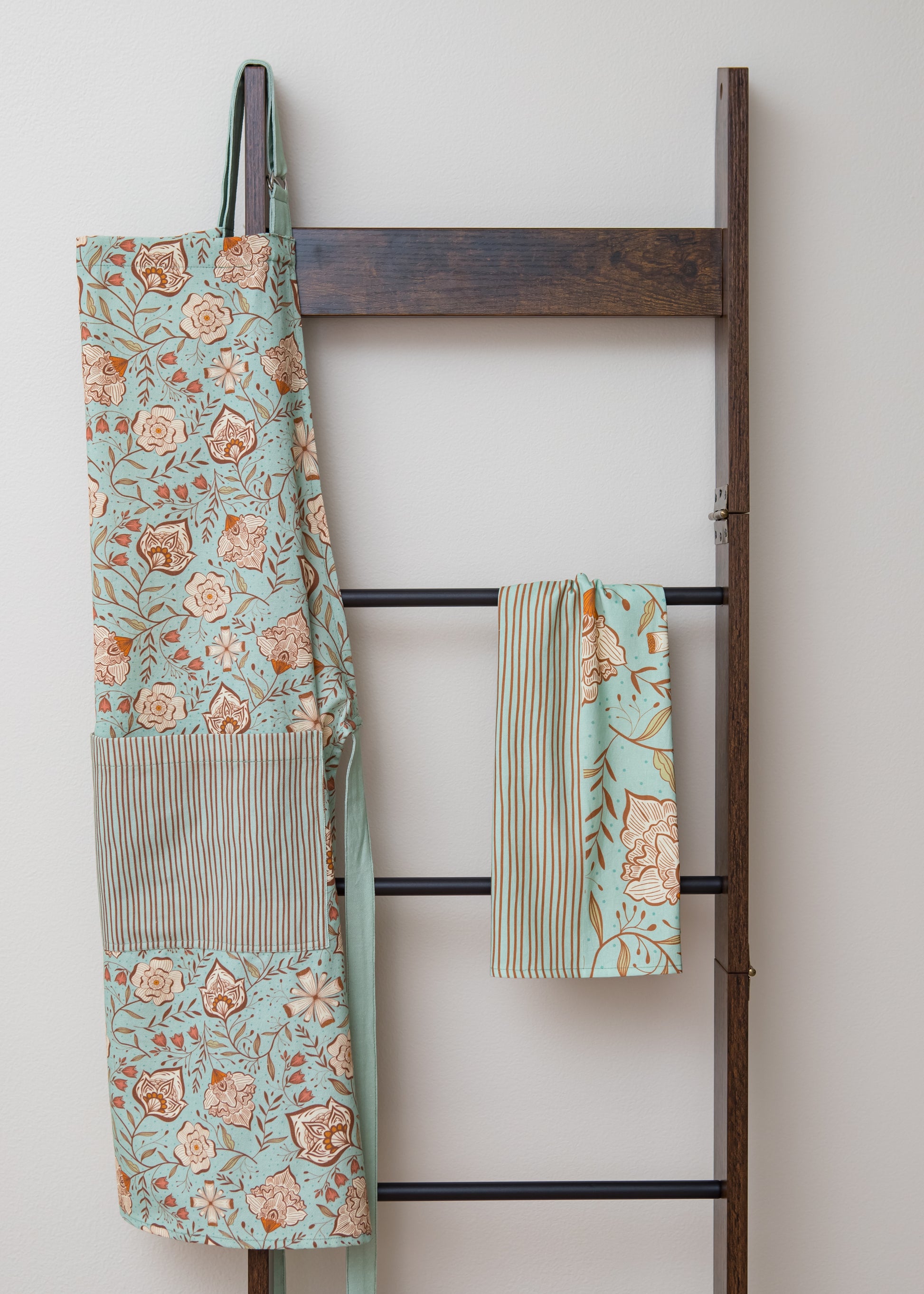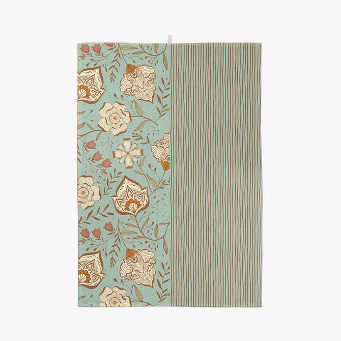 Step into sophistication with the English Garden Tea Towel, featuring beautifully illustrated flowers and vines on one side and coordinating stripes on the other. This tastefully designed towel complements any kitchen, enhanced by a sew-in hang hook for easy display. Pair it with the matching apron for a refined and elegant kitchen set.