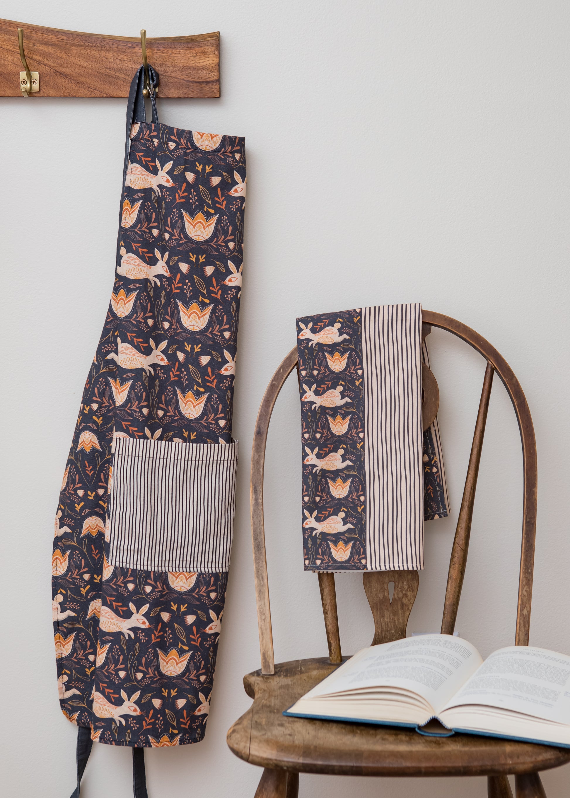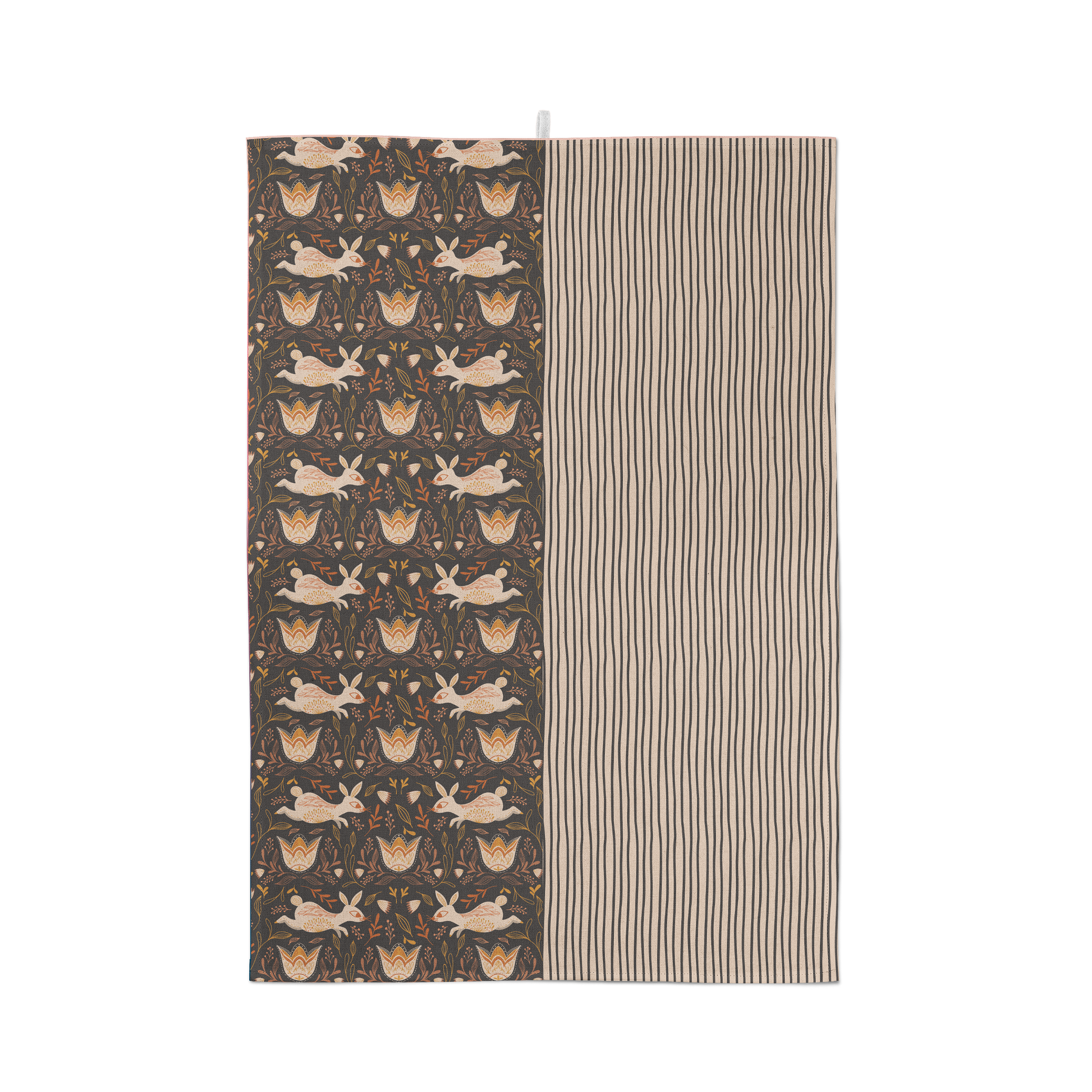 The Fall Bunnies Tea Towel features an elegant forest-themed pattern with bunnies and flowers on one half, and coordinating stripes on the other, creating a charming and functional piece of kitchen décor. This tea towel adds a touch of whimsy to any kitchen, and its sew-in hang hook makes it as practical as it is picturesque. Perfect for drying dishes or simply beautifying the space, and a matching apron is available to complete the look.