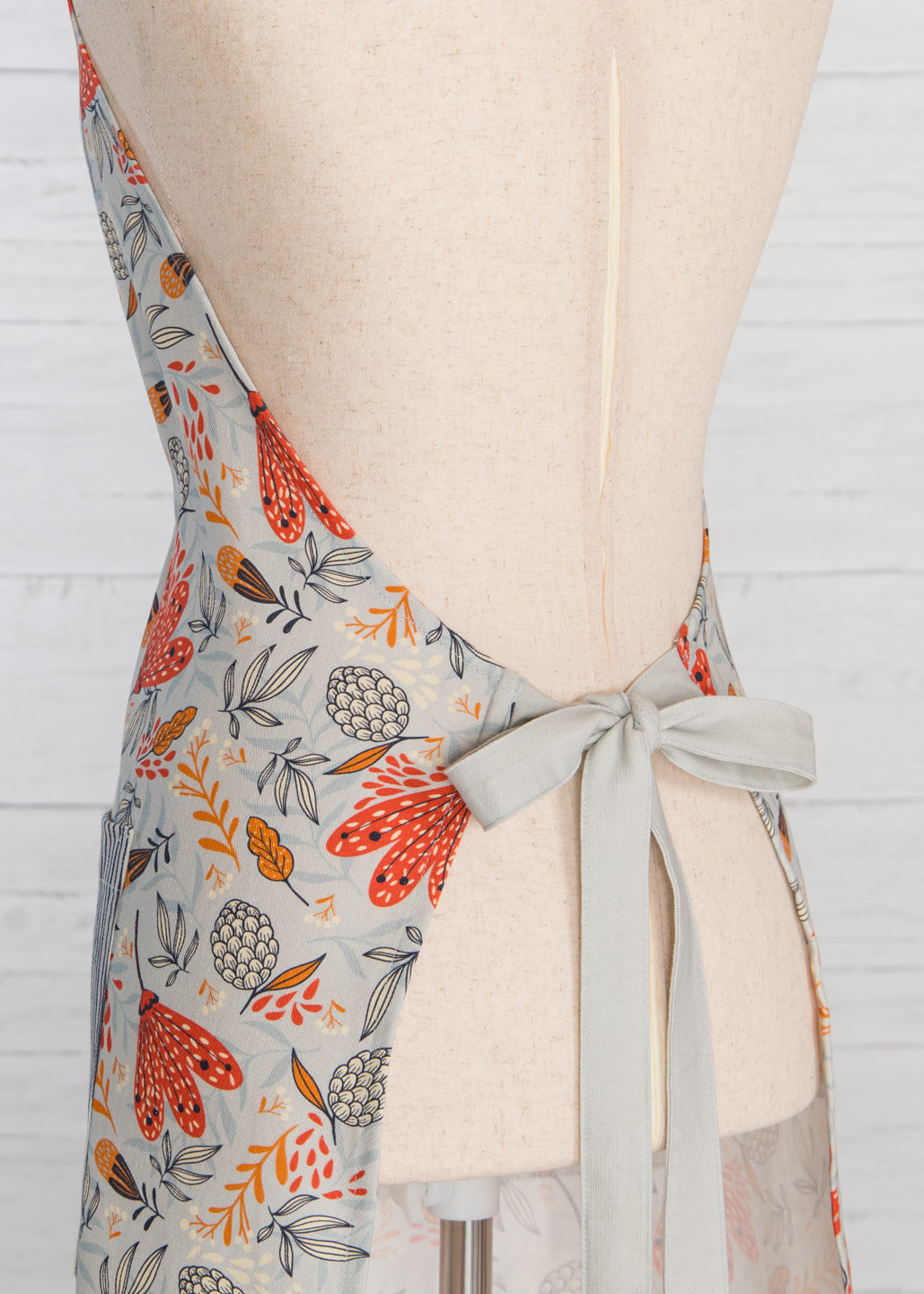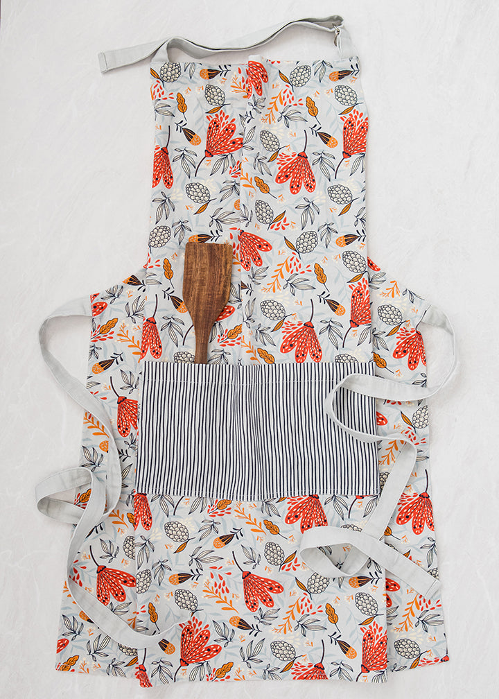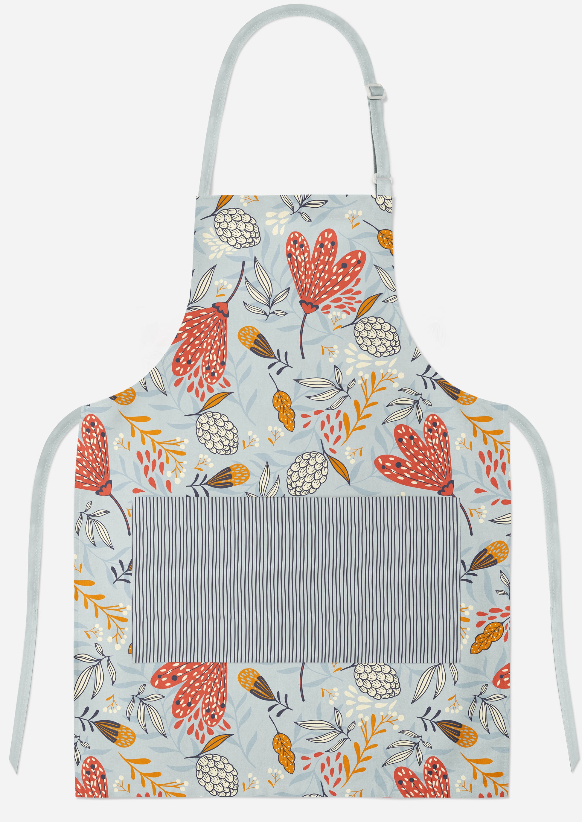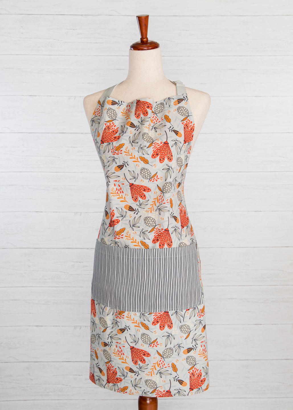 Celebrate the richness of autumn with the Fall Lust apron. Its light blue background is adorned with a mix of orange, navy blue, and rust flowers, along with yellow leaves and acorns, creating a lovely tableau that marries style with function. This apron’s design makes it perfect for seasonal kitchen activities, crafting, or even light gardening. Equipped with a handy front pocket, it’s a thoughtful gift that shop owners should keep in stock for the fall season and beyond.