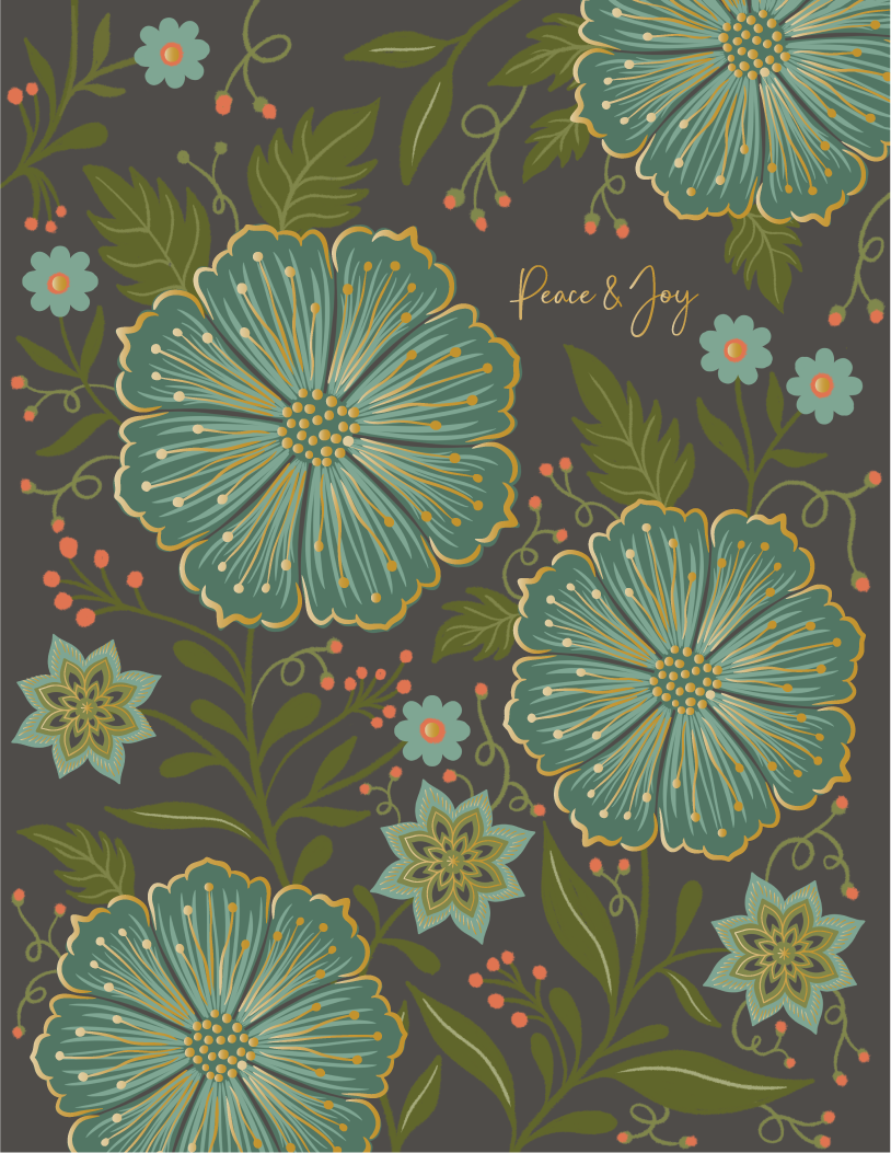 Celebrate the season with the “Peace and Joy” Foil Holiday Card, featuring hand-drawn winter florals, teal blooms, green leaves, and salmon berries on a rich charcoal background. Accented with gold foil details and the phrase “Peace and Joy,” this elegant design is perfect for Christmas, Hanukkah, New Year’s, and winter celebrations. A warm, versatile choice for shoppers seeking artist-made holiday cards with elevated charm.