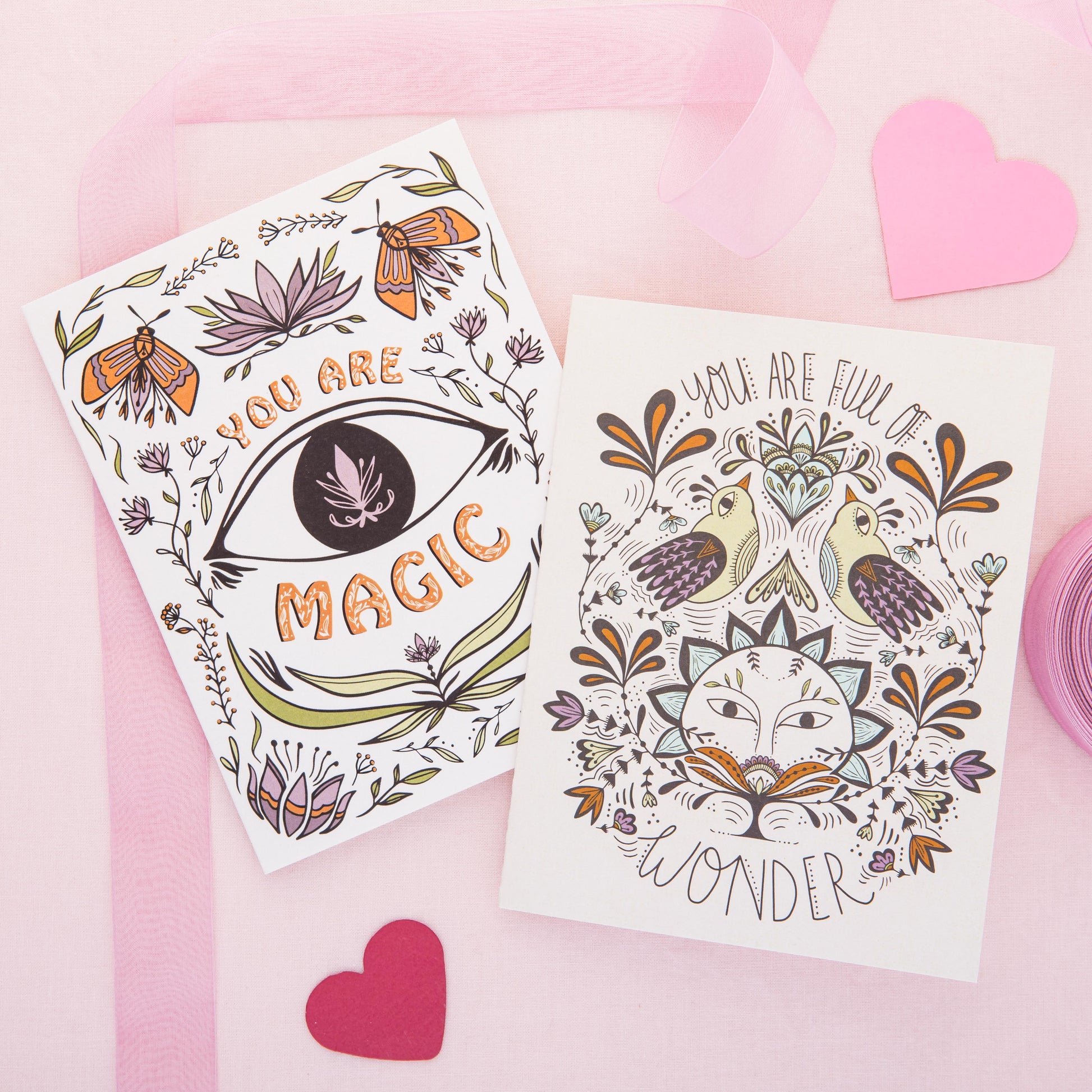 Send a message of encouragement with the You Are Full of Wonder Card. Featuring a hand-drawn sun, birds, and intricate linework in soothing purples, greens, and blues, this meaningful design is perfect for get-well wishes, everyday support, or reminding someone of their light. Pair it with matching stickers for a thoughtful gift.