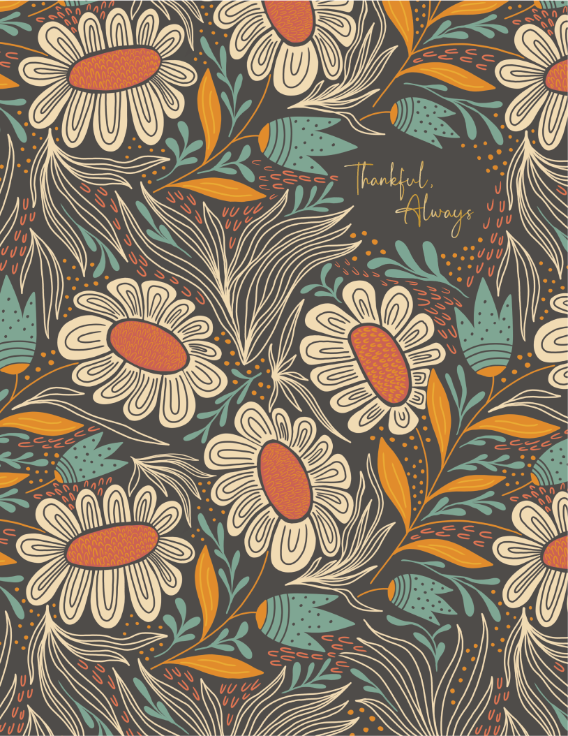 Celebrate gratitude year-round with our “Thankful Always” Foil Floral Card, featuring hand-drawn autumn florals in deep orange, marigold, cream, and teal on a rich charcoal background. The gold foil message adds warmth and elegance—perfect for Thanksgiving, fall gatherings, seasonal gifting, or everyday appreciation. A cozy, modern card with timeless, artisanal charm.