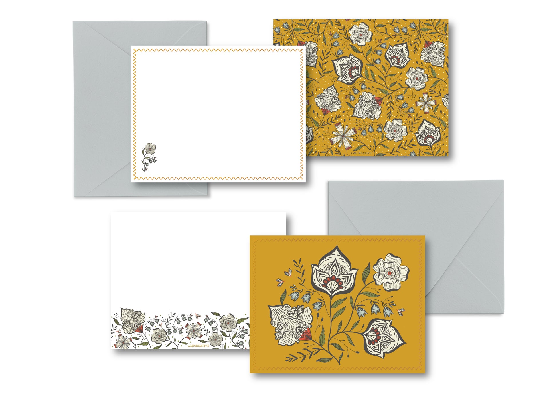 Ochre Yellow Floral Luxury Stationery Set – 8 Flat Notecards