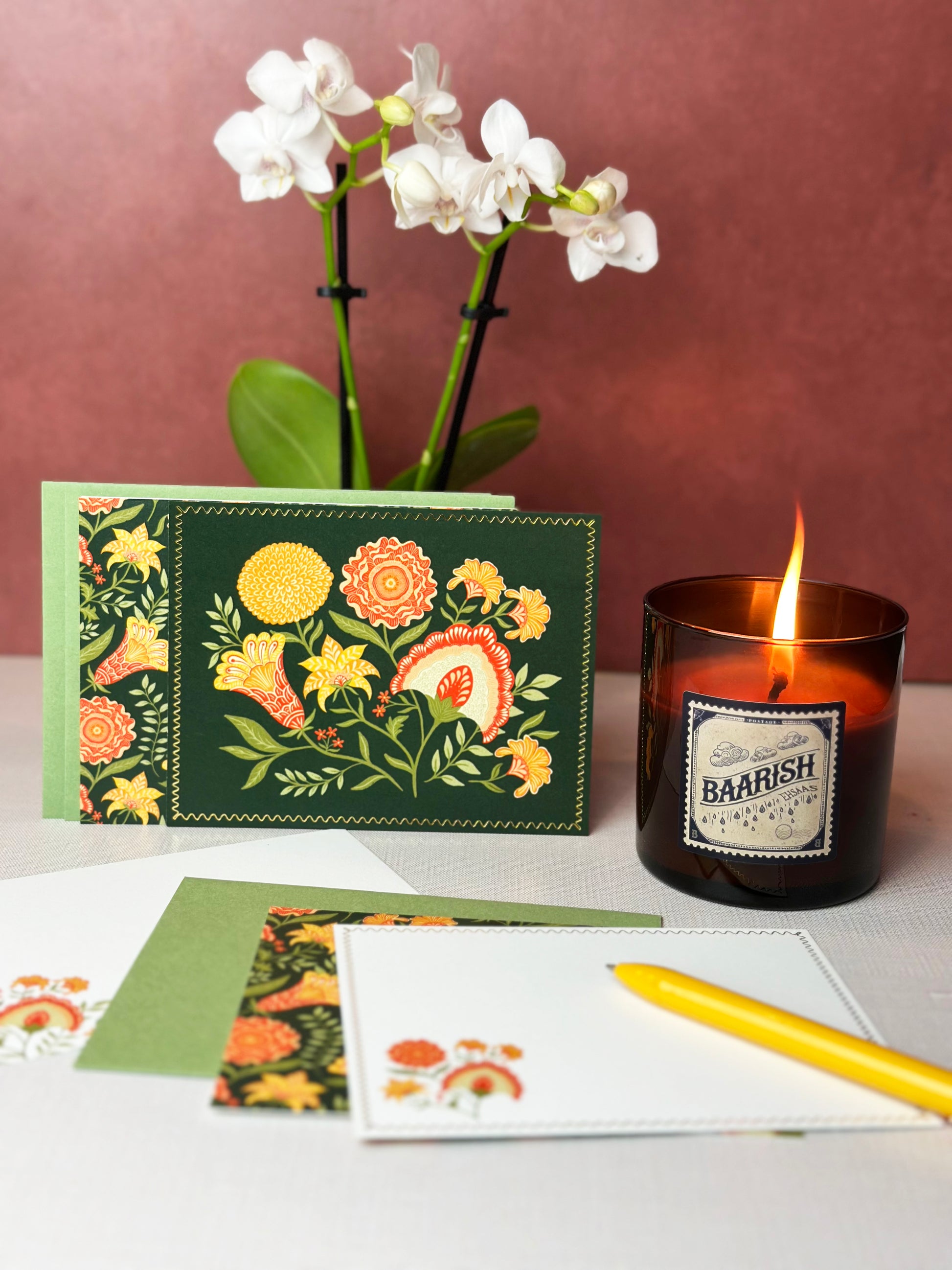 - Includes: 1 Green Botanical Florals Boxed Notecard Set, 1 Garden Blooms Notepad, 1 Baarish (Rain) Candle