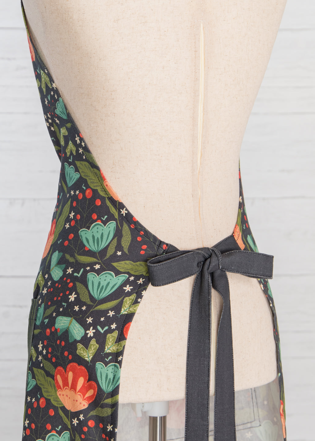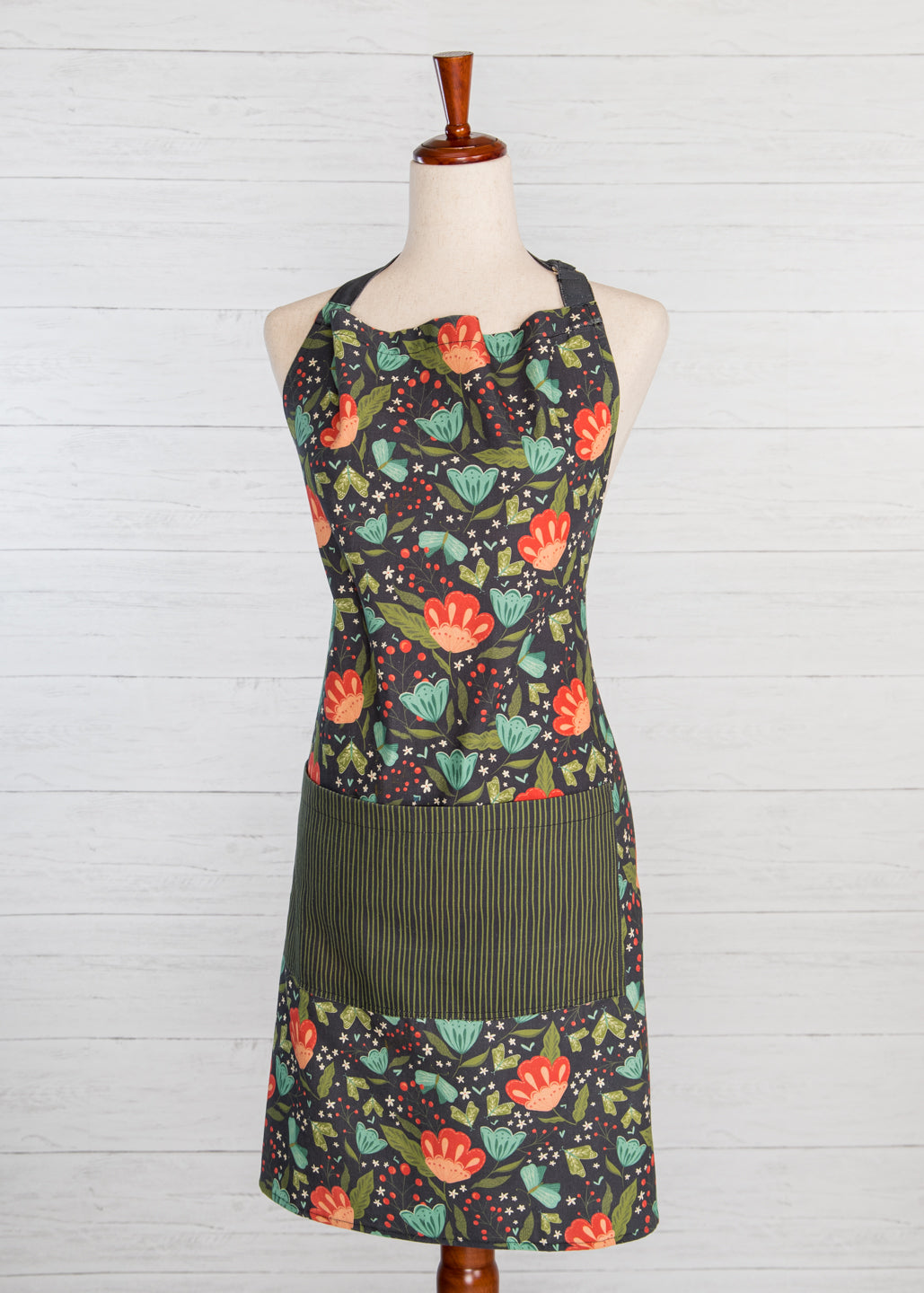 The May Flowers apron features a dark background that sets the stage for large blue and coral blooms, accompanied by fluttering moths and butterflies among green leaves. This design captures the essence of spring and brings the beauty of the outdoors inside. Its large front pocket is not only practical but stylish, striped in complementary colors. An ideal choice for those who appreciate nature’s beauty, this apron is a must-have for any shop owner looking to offer a gift that combines artistry with functionality.