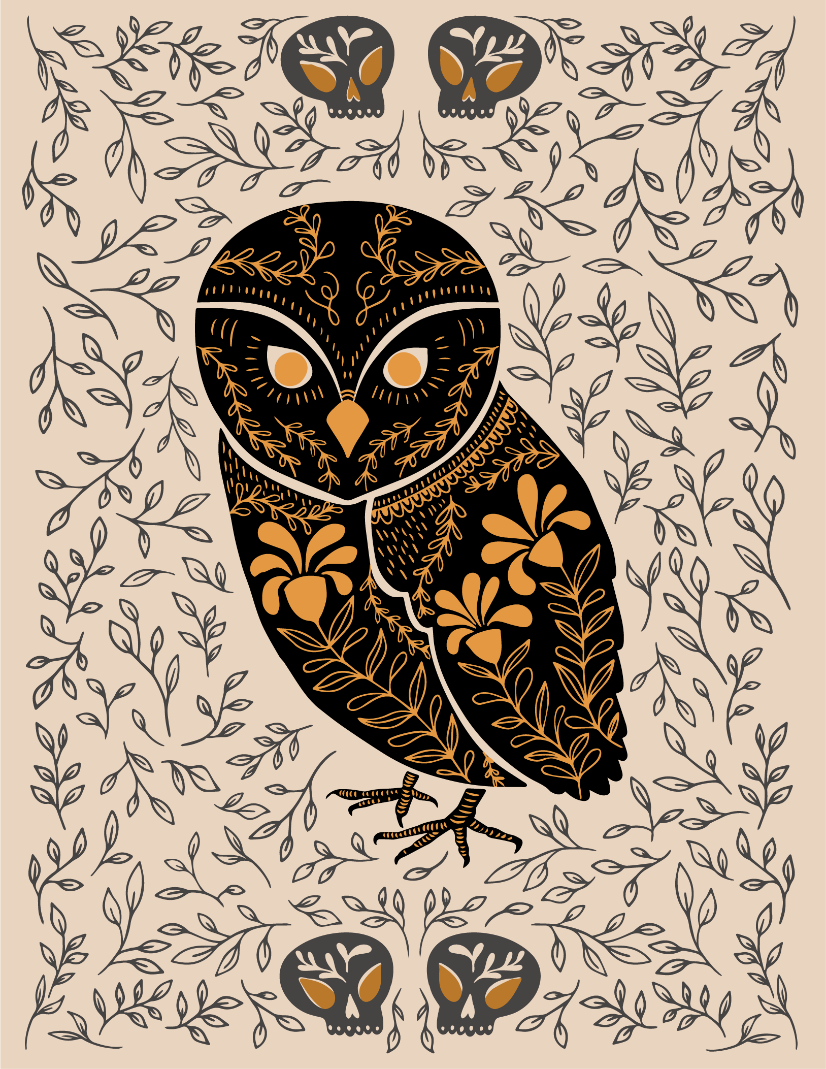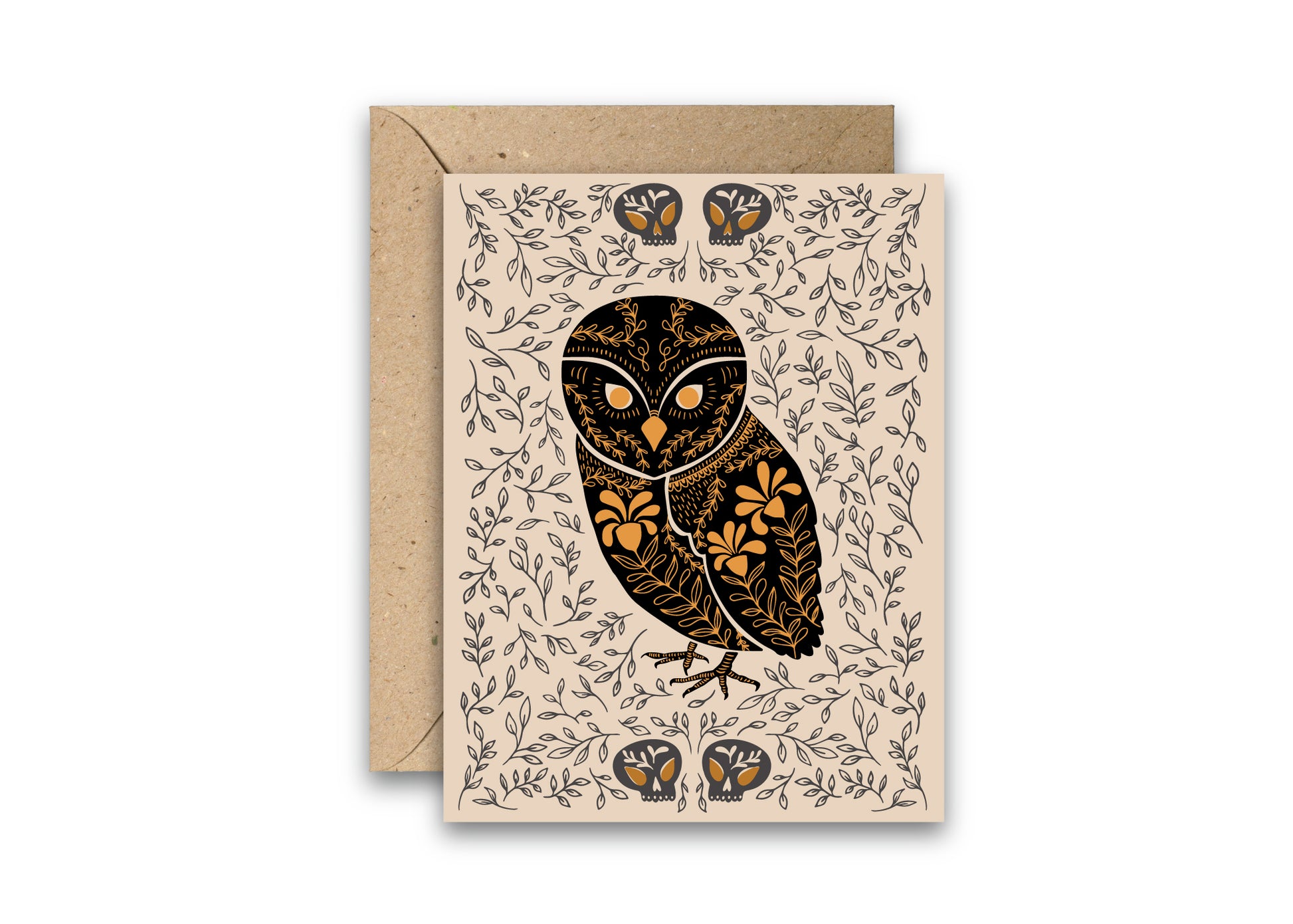 Embrace the mystique of the Owl Dark Omens Greeting Card. Featuring a gothic black owl with grey leaves, and delicate skull details, this hauntingly beautiful design is perfect for Halloween or year-round greetings with dark elegance. Pair it with other designs from the Dark Omens collection for a complete set.