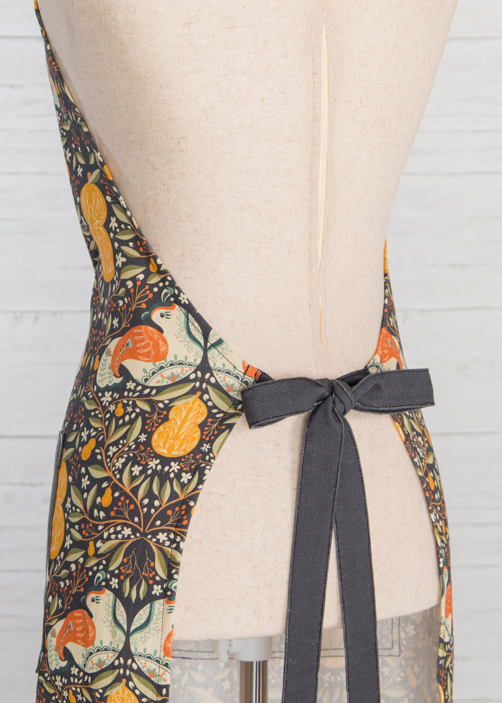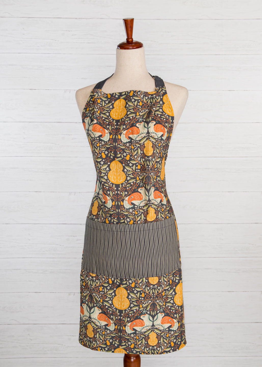 The Pear Tree apron showcases a lush and elegant pattern with partridges in cream and coral details, alongside large golden pears, flowers, berries, and green leaves on a dark background. This richly designed apron not only protects attire but also adds a touch of luxury to everyday tasks. With its large front pocket for essentials, this apron is perfect for those who love to blend style with practicality in their kitchen or garden adventures.