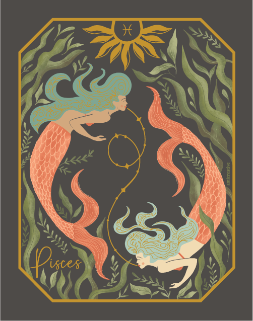 Celebrate the mystical allure of Pisces with our "Pisces Gold Foil Vinyl Sticker." It features two mermaids with blue hair and coral-colored fins, bound by green leaves, with striking gold foil accents. The elegant design is framed by a golden sun and Pisces symbol, perfect for adding a touch of magic to any item. The gold foil details bring an ethereal glow, making it a standout piece. This sticker is ideal for enhancing personal items like journals, tablets, and phone cases, providing a waterproof and durable decoration.