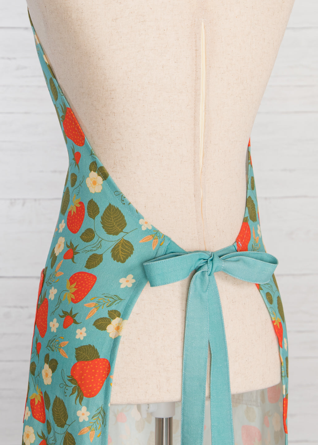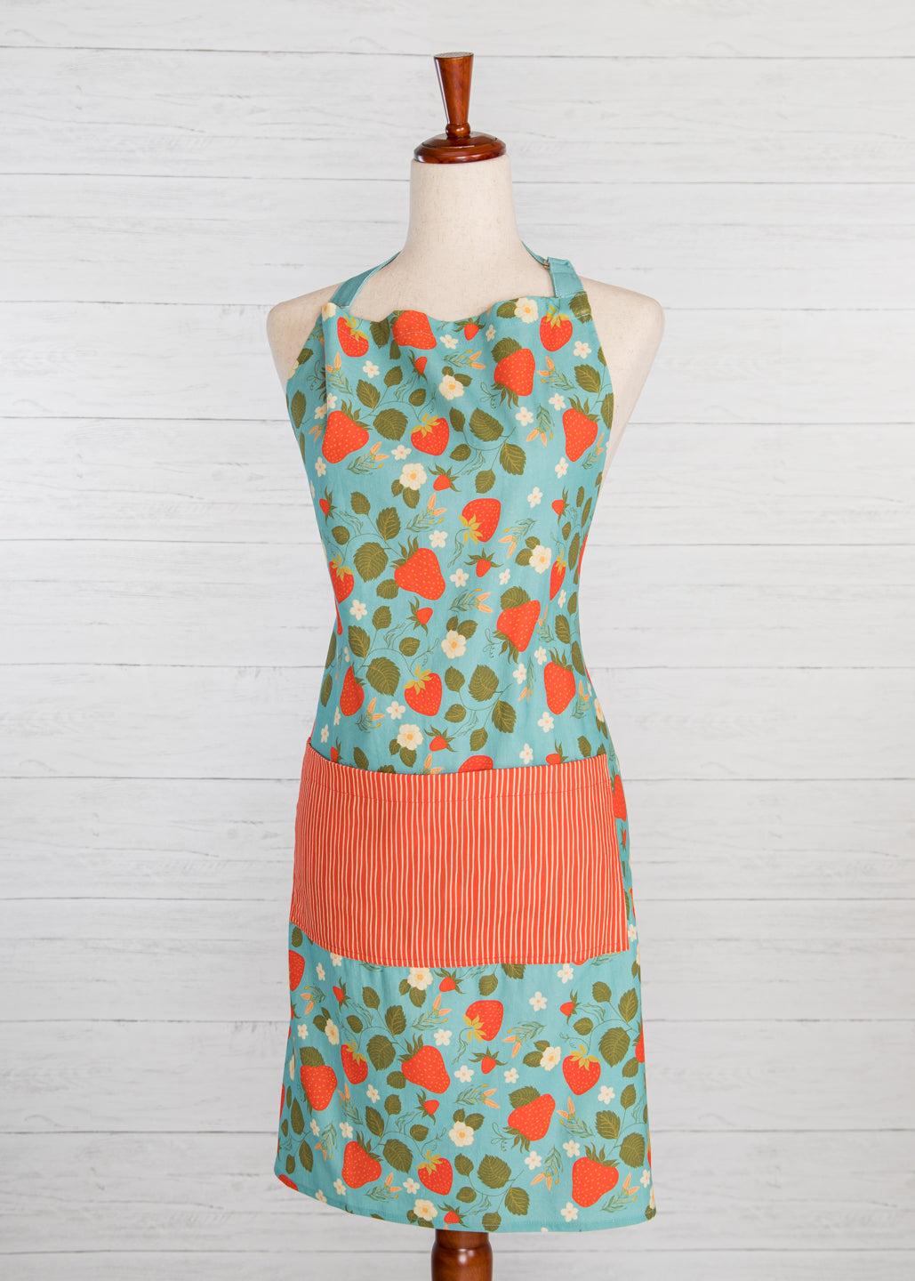 Bright and cheerful, the Strawberry Fields apron features a vibrant blue background with juicy red strawberries, white flowers, and green leaves. The contrasting red striped pocket not only stands out but also serves as a handy helper for those busy days in the kitchen or garden. This apron is a delightful accessory that combines functionality with a splash of fun, making it an excellent gift choice for any occasion.