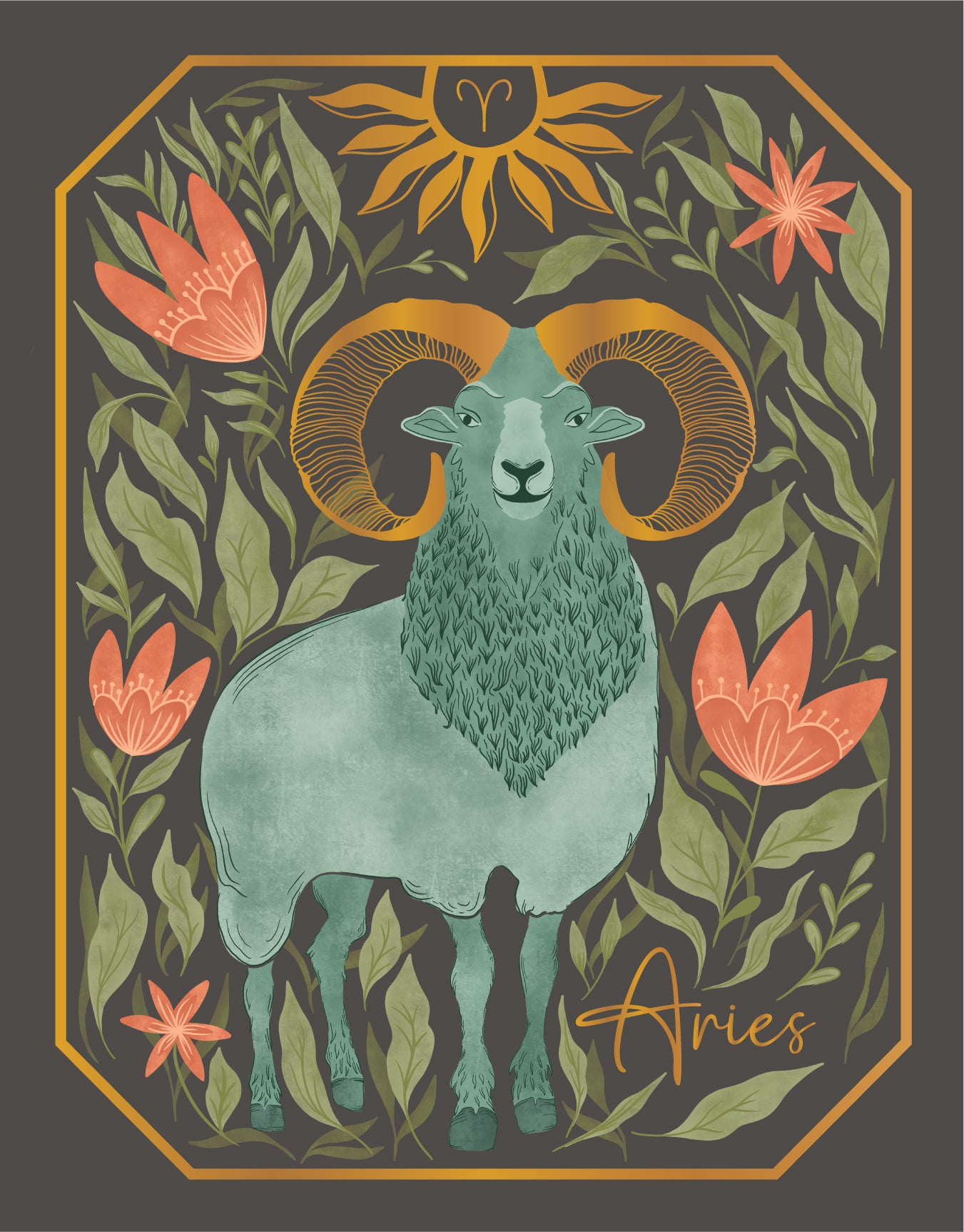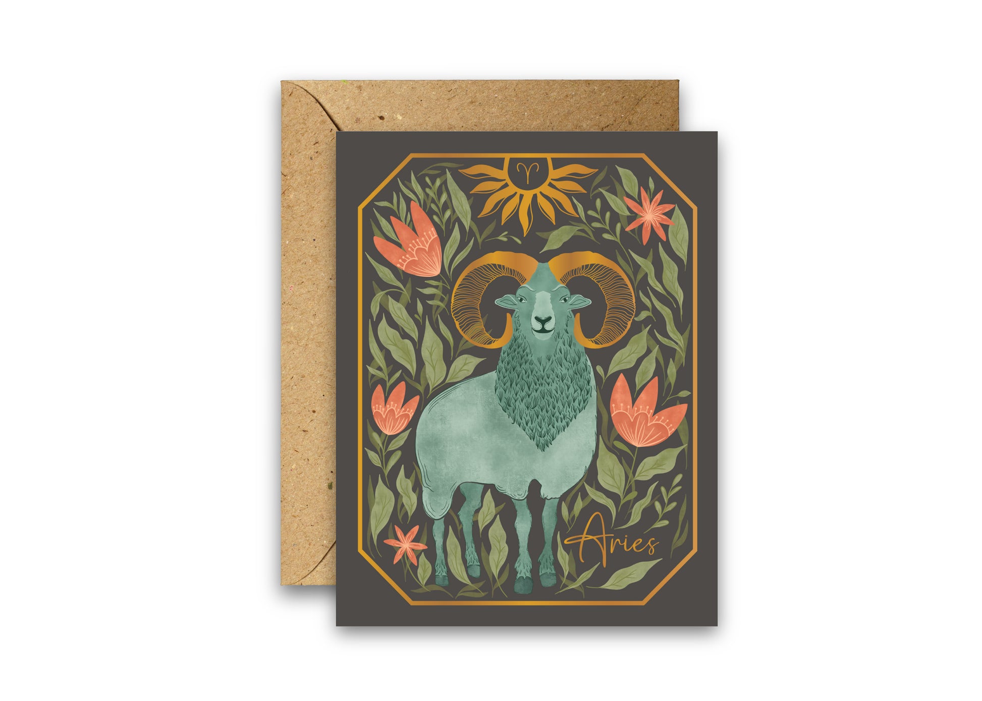 Our "Aries Gold Foil Greeting Card," showcases a majestic ram with golden horns surrounded by vibrant florals. Ideal for Aries birthday celebrations or as a symbol of courage for any occasion, this card captivates and inspires. The card’s back provides insightful details on Aries characteristics and key dates, making it a gift that educates and delights.