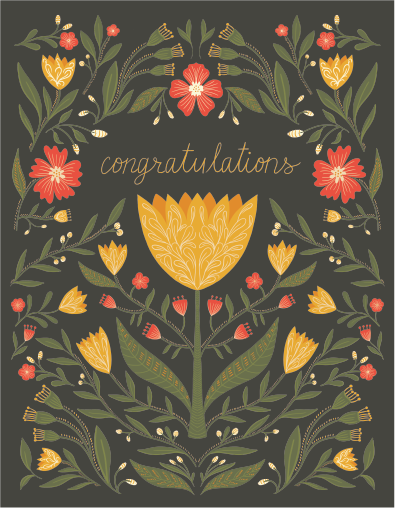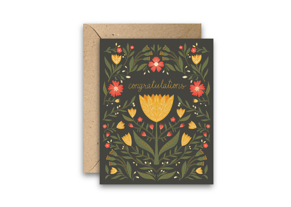 Celebrate life’s special moments with the "Tulip Garden Congratulations Card", a stunning choice for weddings, engagements, graduations, and other milestones. Featuring vibrant yellow tulips surrounded by lush red and green foliage, all set against a sophisticated dark gray background, this card is a bold and elegant way to say "Congratulations." The intricate floral design and the word "Congratulations" displayed in the center make it a memorable keepsake for any occasion.