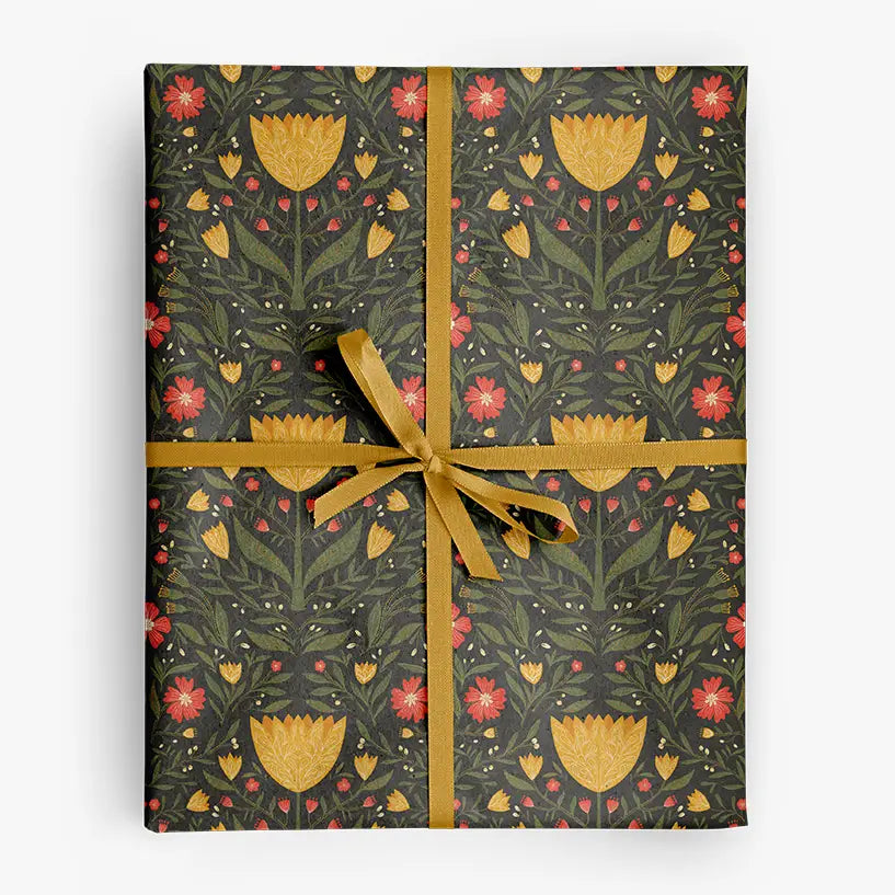 Bright and bold, the Tulip Garden Wrapping Paper features a hand-drawn floral design by Amita Nair with large yellow tulips, green leaves, and red and yellow accent blooms on a charcoal background. Inspired by folk art and lush spring gardens, this richly detailed wrap is perfect for Mother’s Day, birthdays, spring gifting, and creative packaging year-round.