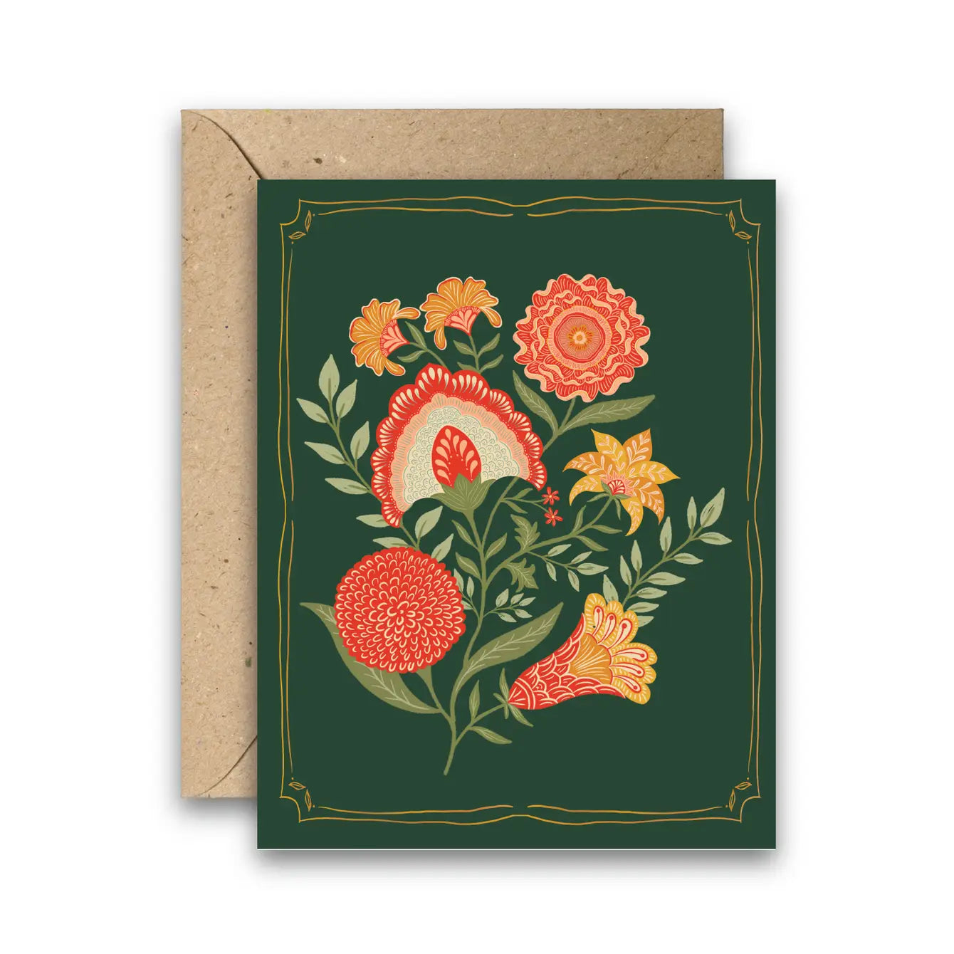 Introducing the "Winter Blooms - Year-Round Floral Greeting Card," a stunning design featuring a vibrant bouquet of red, yellow, and gold flowers, intricately detailed with gold foil on a lush green background. Perfect for any occasion—Mother’s Day, Valentine’s Day, or simply thinking of you—its timeless, wordless front makes it a versatile choice for flower lovers and anyone who appreciates a touch of elegance.