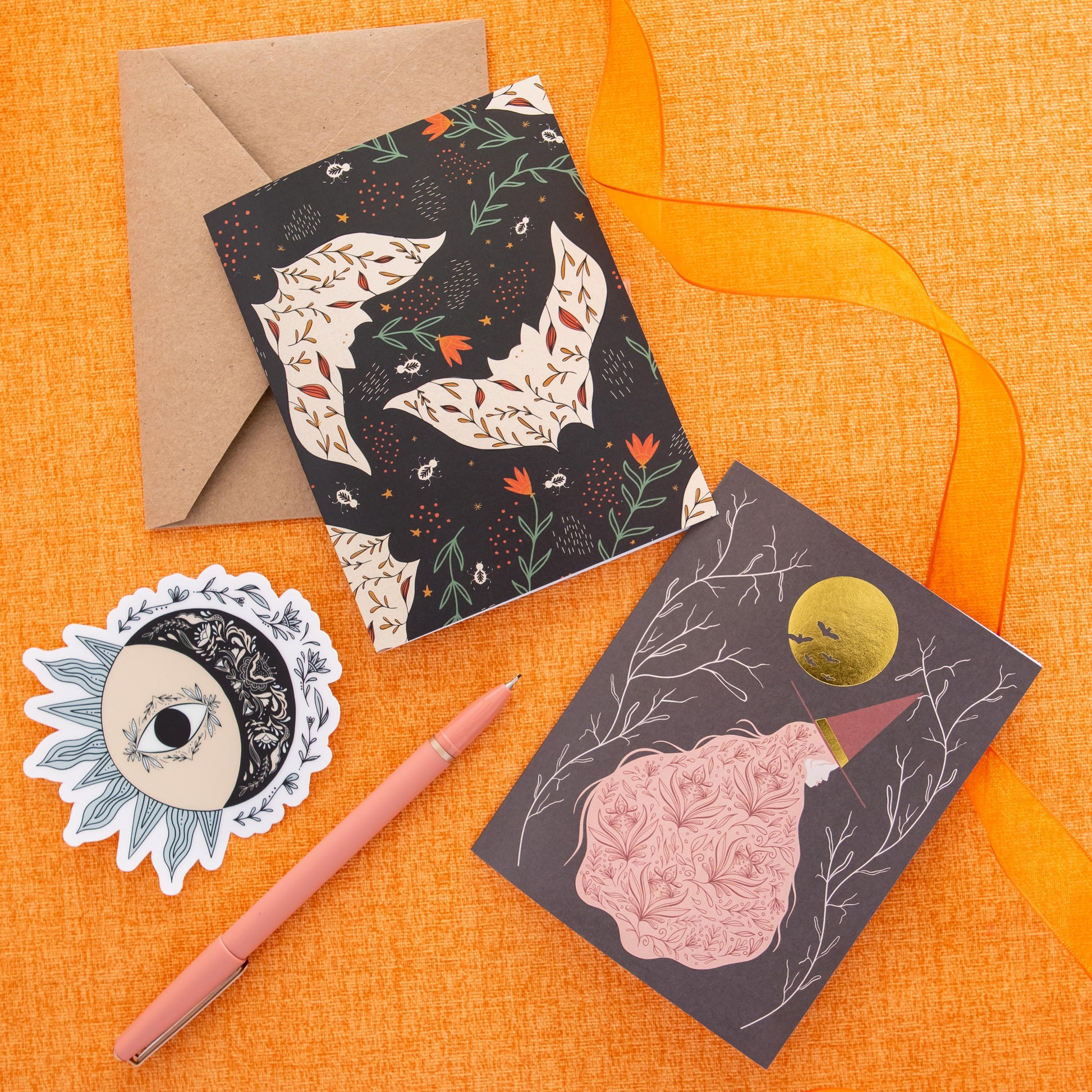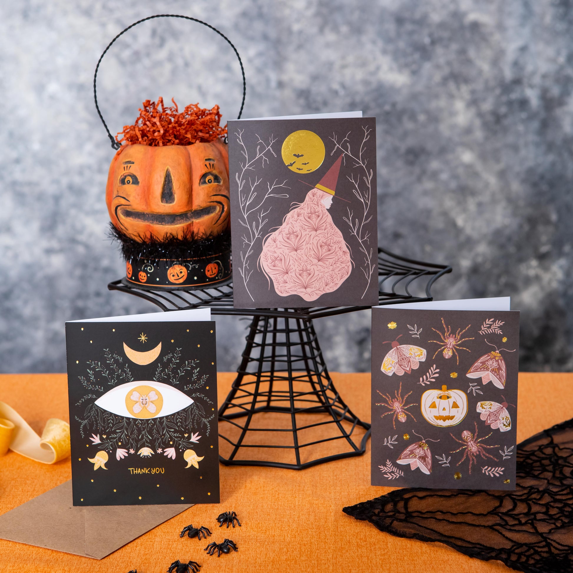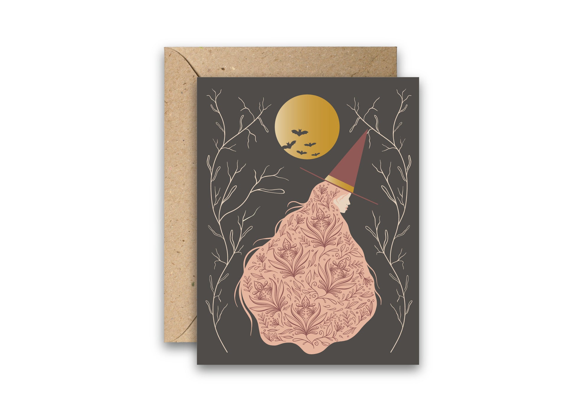 Cast a spell with the Witch’s Moon Greeting Card. Featuring a gold foil moon, bats, and a powerful witch set against a haunting gray sky, this hand-illustrated design is perfect for Halloween, gothic celebrations, and anyone who loves mystical, witchy aesthetics.